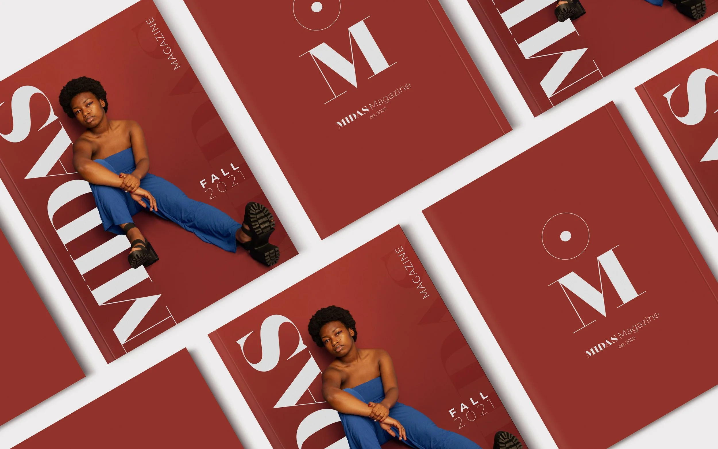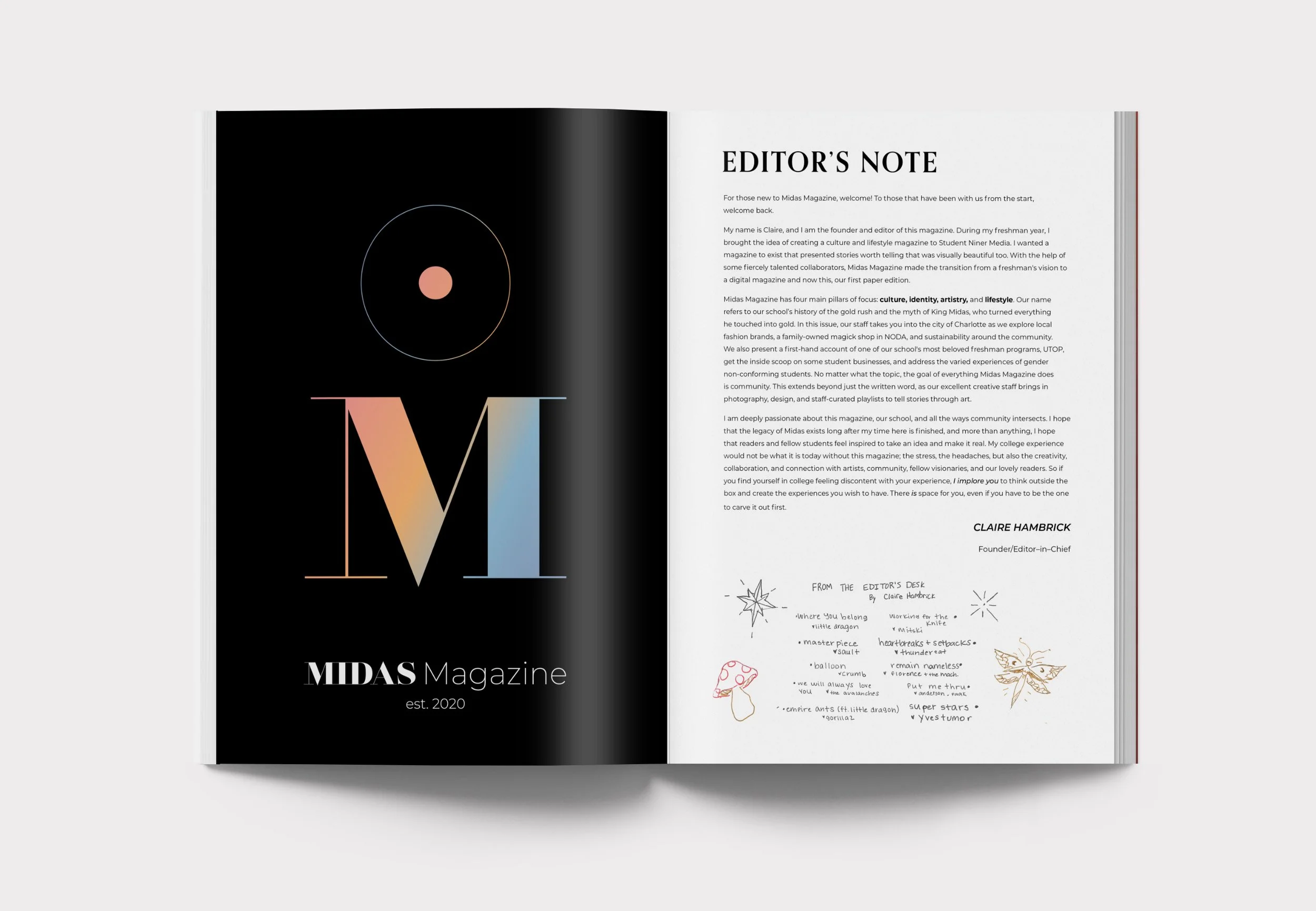 In the Fall Semester of 2021, I had the privilege of working as the Design Director for Midas Magazine, leading a wonderful and diverse team of designers: Corina Hellmer, Kevin Ku, and Moi Tanchico to create this 80+ page publication. Midas Magazine is the latest addition to Student Niner Media at UNC Charlotte, focusing on four main pillars: culture, identity, artistry, and culture.